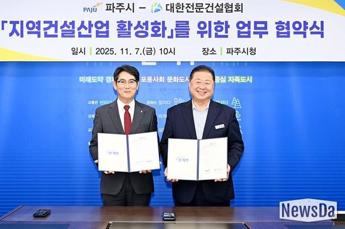 뉴스다 최광묵 기자 | 파주시와 대한전문건설협회 경기도회 파주시운영위원회는 지역 건설산업 활성화를 위한 상생 업무협약을 체결하고, 관내 건설 경기 부양을 위해 적극 협력하기로 뜻을 모았다.