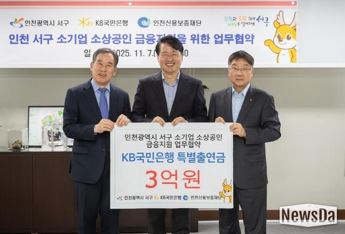 뉴스다 최광묵 기자 | 인천 서구는 지난 7일 국민은행, 인천신용보증재단과 함께 45억원 규모의 ‘소기업·소상공인을 위한 금융지원 협약보증’ 업무 협약을 체결했다고 밝혔다.