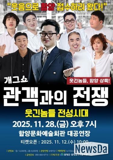 뉴스다 최광묵 기자 | 함양문화예술회관은 오는 11월 28일 오후 7시 대공연장에서 개그쇼 ‘관객과의 전쟁’ 공연을 진행한다고 밝혔다.