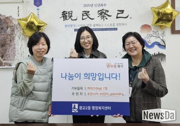 임지희 관리사무소장은 “단지 내 어려운 이웃들을 생각하며 작게나마 힘이 되고 싶었다”며 “이 백미가 추운 겨울을 앞두고 따뜻한 식탁 위에 놓여 작은 희망이 되길 바란다”고 말했다.