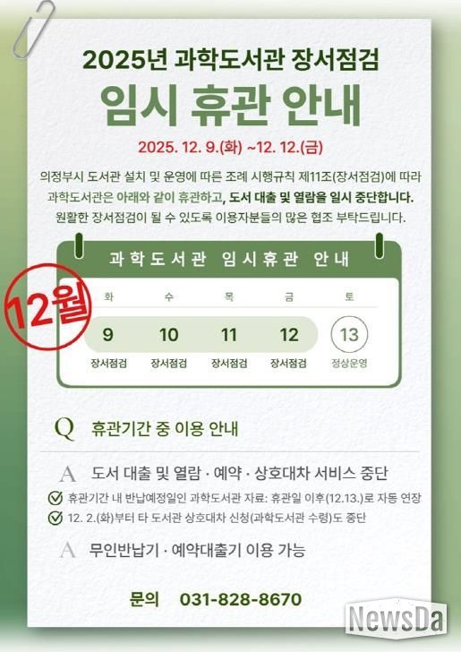 뉴스다 최광묵 기자 | 의정부과학도서관은 소장 자료의 상태와 보유 현황을 체계적으로 점검하기 위해 12월 9일부터 12일까지 4일간 임시 휴관한다.