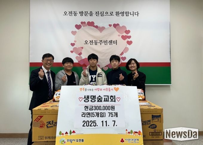 뉴스다 최광묵 기자 | 의왕시 오전동에 위치한 생명숲교회가 11월 7일, 어려운 이웃을 돕기 위해 성금 30만 원과 라면 75개를 오전동주민센터에 기부하며 지역사회에 따스한 온정을 전했다.