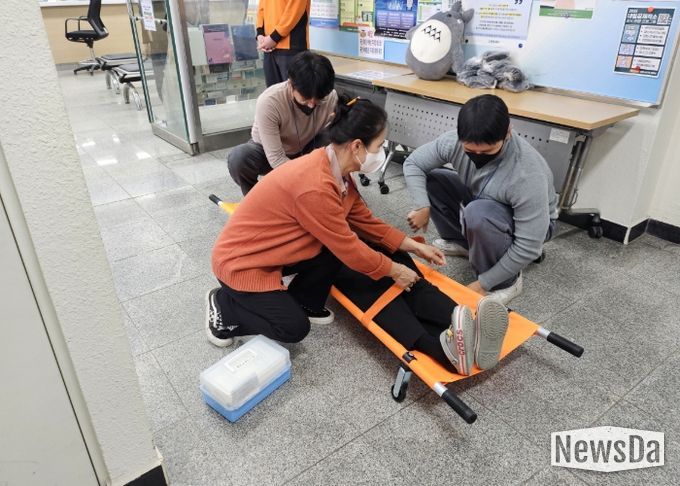 훈련은 실제 화재 발생 상황을 가정해 ▲화재 상황 전파 및 119 신고 ▲소방 발신기 작동 ▲직원과 민원인 대피 유도 ▲주요 물품 반출 ▲소화기 사용법 교육 ▲응급환자 이송 등 단계별 절차를 실습하며 진행됐다.