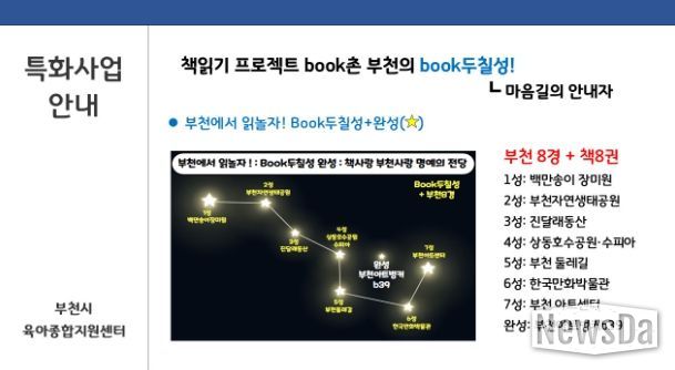 뉴스다 최광묵 기자 | 부천시육아종합지원센터는 ‘책 읽는 도시 부천’에 발맞추어 2025년 영유아 독서 특화사업 ‘BOOK촌 부천의 BOOK두칠성!’으로 영유아의 발달적 특성과 요구에 맞춘 다양한 독서 프로그램을 운영하고 있다.