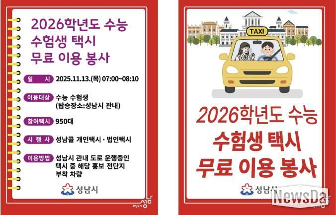 개인택시와 법인택시 총 950여 대가 오전 7시부터 8시까지 ‘2026학년도 수능 수험생 택시 무료 이용 봉사’ 표지를 부착하고, 수험생을 대상으로 시험장까지 무료 운행 서비스를 제공한다. 수험생은 성남콜택시(031-755-4000)를 통해 택시를 호출하면 시험장까지 무료로 이동할 수 있다.