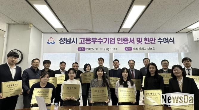 뉴스다 최광묵 기자 | 성남시는 어려운 경제 여건 속에서도 지역 일자리 창출에 기여한 18개 기업을 ‘2025년 고용우수기업’으로 선정하고, 10일 인증서와 현판을 수여했다.