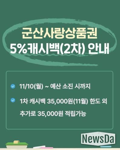 혜택은 11월 10일부터 예산이 소진될 때까지 시행되며, 모바일형 및 카드형 군산사랑상품권을 사용하는 시민이 대상이다.