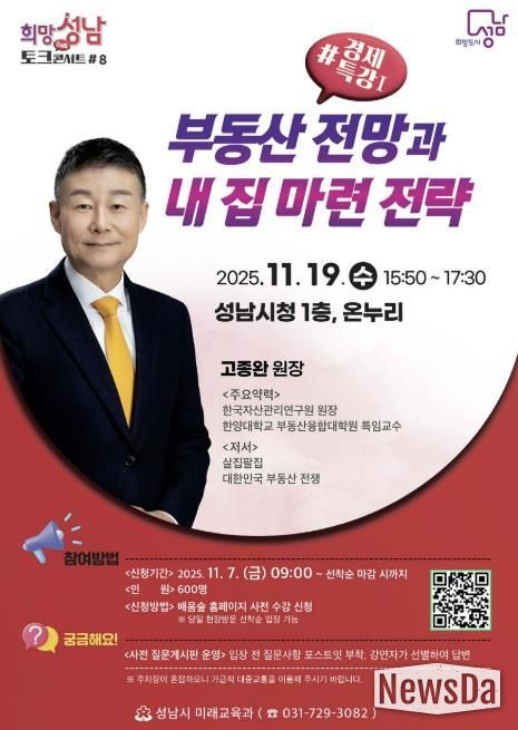 뉴스다 최광묵 기자 | 성남시는 오는 11월 19일 오후 3시 50분~5시 30분 시청 1층 온누리에서 ‘부동산 전망과 내 집 마련 전략’을 주제로 한 희망성남 토크콘서트 8강을 연다.