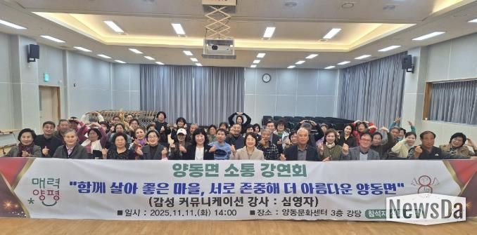 뉴스다 최광묵 기자 | 양평군 양동면은 11일 오후 2시 양동문화센터 3층 대강당에서 ‘함께 살아 좋은 마을, 서로 존중해 더 아름다운 양동면’을 주제로 소통강연회를 개최했다.