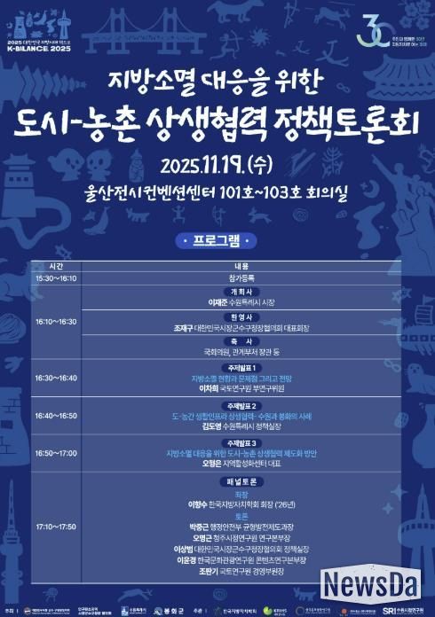 수원특례시(시장 이재준)는 11월 19일 오후 4시 울산전시컨벤션센터 1층에서 ‘지방소멸 대응을 위한 도시–농촌 상생협력 정책토론회’를 개최한다.