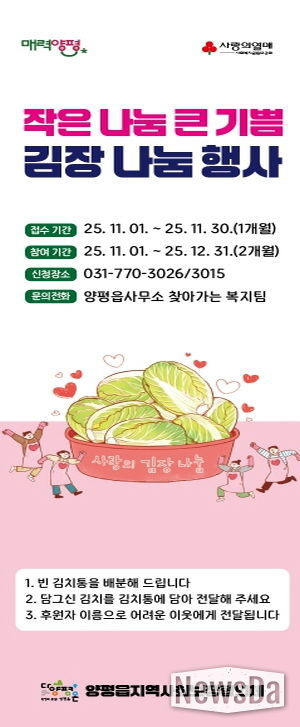 뉴스다 최광묵 기자 | 양평군 양평읍은 11월 1일부터 12월 31일까지 두 달간 ‘작은 나눔, 큰 기쁨 김장 나눔 사업’을 추진하며, 관내 취약계층 이웃들에게 정성 가득한 김장김치를 전달한다고 밝혔다.