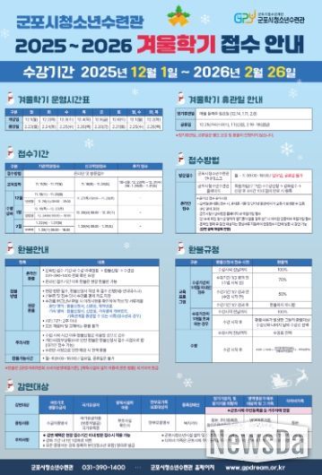 뉴스다 최광묵 기자 | 재)군포시청소년재단 군포시청소년수련관은 오는 12월 1일부터 2025년 2월 26일까지 겨울학기 문화체육 프로그램을 운영한다.