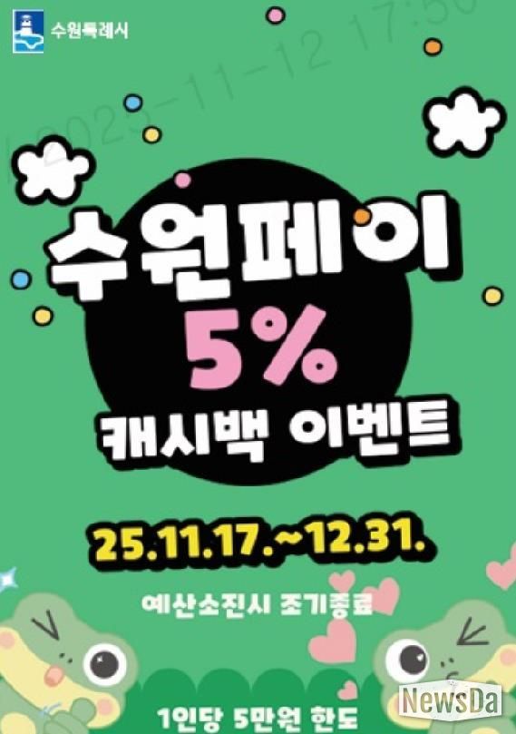 수원특례시는 17일부터 12월 31일까지 ‘수원페이 5% 캐시백 이벤트’를 연다. 수원페이 충전금으로 결제하면 5% 캐시백을 지급한다.