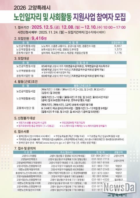 뉴스다 최광묵 기자 | 고양특례시는 2026년 노인일자리 및 사회활동지원 사업에 총 382억원을 투입해, 노인일자리 참여자 9,416명을 수행기관별 통합 모집한다고 밝혔다.