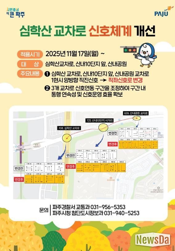 양성원 첨단도시정보과장은 “심학산 교차로는 운정신도시 주민들이 서울 등으로 이동하는 중요한 지점”이라며, “이번 신호체계 개선이 실질적인 소통 개선으로 이어질 수 있도록 지속적으로 점검하고 안정적인 운영을 위해 최선을 다하겠다”라고 밝혔다.