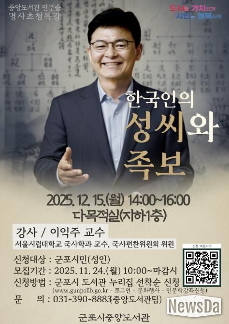 뉴스다 최광묵 기자 | 군포시 중앙도서관이 2025년 하반기 ‘중앙도서관 인문숲’ 명사 초청 특강의 마지막 무대로 서울시립대학교 국사학과 이익주 교수를 초청해 '한국인의 성씨와 족보' 특강을 진행한다. 특강은 12월 15일 오후 2시부터 4시까지 중앙도서관 지하 1층 다목적실에서 진행한다.