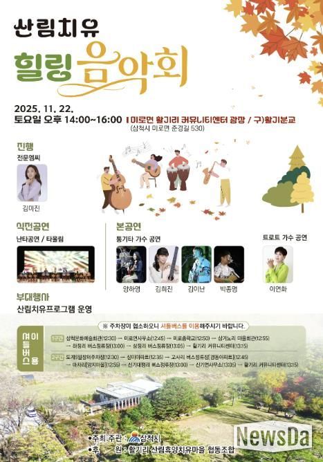 뉴스다 최광묵 기자 | 삼척시는 11월 22일 토요일 오후 2시부터 삼척활기 커뮤니티센터(미로면 준경길 530) 잔디광장에서 ‘산림치유 힐링 음악회’를 연다.