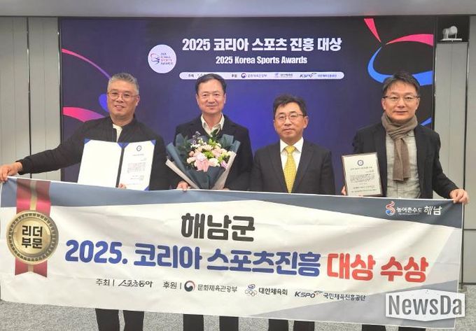 뉴스다 류대현 기자 | 해남군이 2025 코리아 스포츠진흥대상에서 리더부문 대상을 수상하며 스포츠마케팅 역량을 인정받았다.