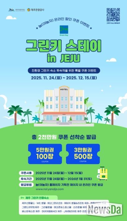 뉴스다 최광묵 기자 | 제주특별자치도와 제주관광공사(사장 고승철)는 오는 24일부터 12월 15일까지 환경친화적 경영활동을 실천하는 사업장에 부여하는 ‘그린키(Green Key)’ 국제인증을 획득한 도내 13개 숙박업소를 대상으로 온·오프라인 통합 이벤트를 진행한다고 19일 밝혔다.