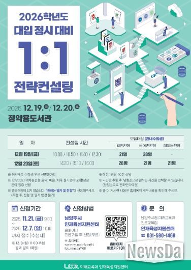뉴스다 최광묵 기자 | 남양주시는 11월 21일부터 12월 7일까지 ‘2026학년도 대입 정시 대비 1:1 전략컨설팅’에 참여할 관내 수험생을 모집한다.