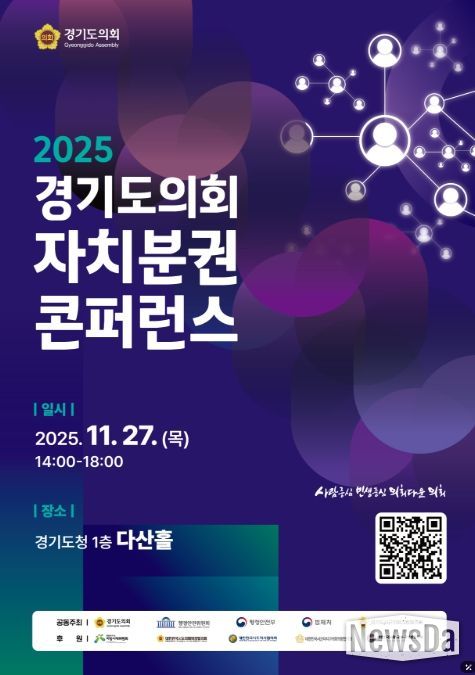 뉴스다 최광묵 기자 | 경기도의회가 진정한 자치분권 실현에 대한 사회적 공감대 확산과 향후 지방자치의 발전 방향 모색을 위한 '2025 경기도의회 자치분권 콘퍼런스'를 오는 11월 27일 목요일 경기도청 다산홀에서 개최한다.