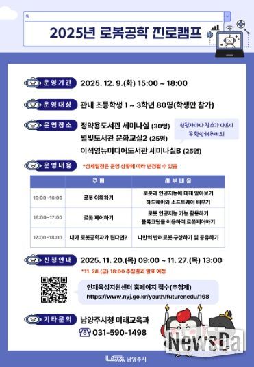 뉴스다 최광묵 기자 | 남양주시는 20일부터 27일까지 관내 초등학교 1학년부터 3학년을 대상으로 ‘2025년 로봇공학 진로캠프’참가자를 모집한다.