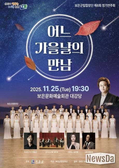 ‘어느 가을날의 만남’이라는 주제로 열리는 이번 공연은 늦가을의 정취 속에서 군민들과 따뜻한 감성을 나누기 위해 마련된 무대로 삶과 사람, 계절의 이야기를 담은 서정적 합창곡들로 관객들에게 깊은 울림을 전할 예정이다.