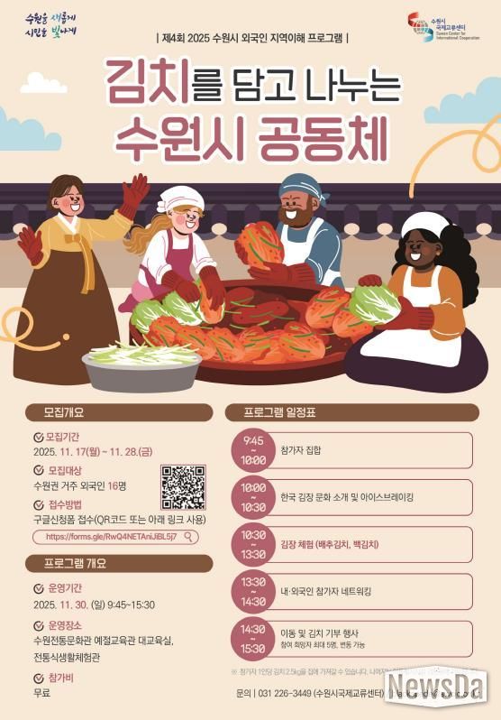 수원시국제교류센터 관계자는 “외국인 주민이 김치를 담그고 기부하며 지역사회 구성원으로서의 소속감을 키우는 데 도움이 될 것”이라며 “한국의 생활 문화와 공동체 정신을 자연스럽게 배울 수 있을 것”이라고 기대했다.
