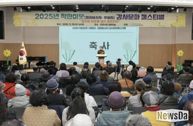 뉴스다 최광묵 기자 | 군포시노인복지관은 11월 19일 군포시청 2층 대회의실에서 ‘2025 착한이웃(후원자·자원봉사자) 성과보고 및 감사행사 – 감사·문화페스티벌 ’감사의 씨앗을 널리 퍼트리다‘를 개최했다.