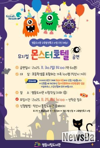 뉴스다 최광묵 기자 | 익산시는 오는 30일 오후 2시 영등도서관에서 어린이 뮤지컬 '몬스터 호텔'을 선보인다.