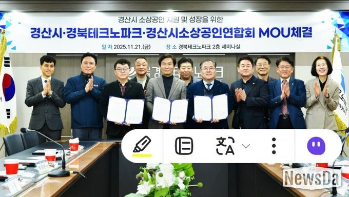뉴스다 최광묵 기자 | 경산시는 21일 경북테크노파크 세미나실에서 경북테크노파크, 경산시소상공인연합회와 함께 ‘소상공인 성장 지원 업무협약(MOU)’을 체결했다고 밝혔다.