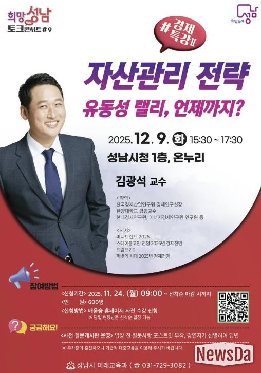 뉴스다 최광묵 기자 | 성남시는 오는 12월 9일 오후 3시 30분~5시 30분 시청 1층 온누리에서 ‘자산관리 전략’을 주제로 한 올해 희망성남 토크콘서트 마지막 강연을 연다.