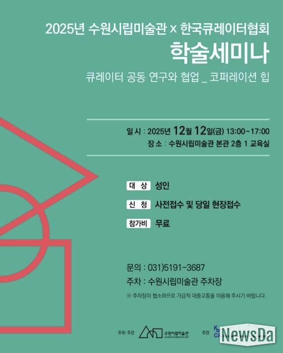 뉴스다 최광묵 기자 | 경기도 수원시립미술관은 한국큐레이터협회와 함께 2025년 학술 세미나 '큐레이터 공동 연구와 협업-코퍼레이션 힙'을 주제로 12월 12일 오후 1시 수원시립미술관 행궁 본관에서 개최한다.