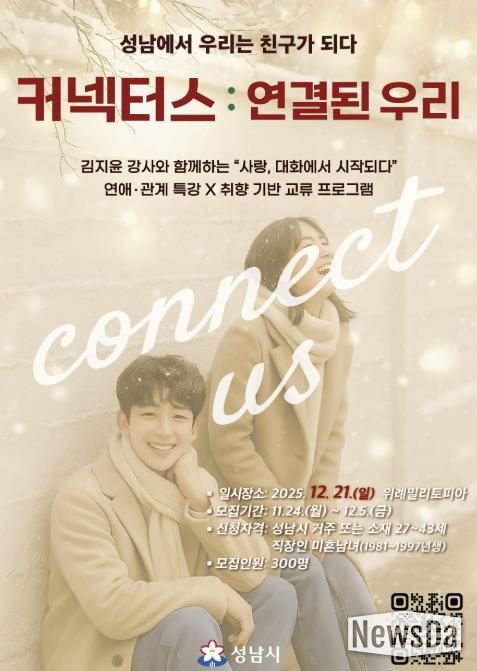뉴스다 최광묵 기자 | 성남시는 새로운 친구를 만들 수 있는 청년 교류 행사 ‘커넥터스(Connect-us) 연결된 우리’ 참가 희망자 300명을 오는 12월 5일까지 모집한다.