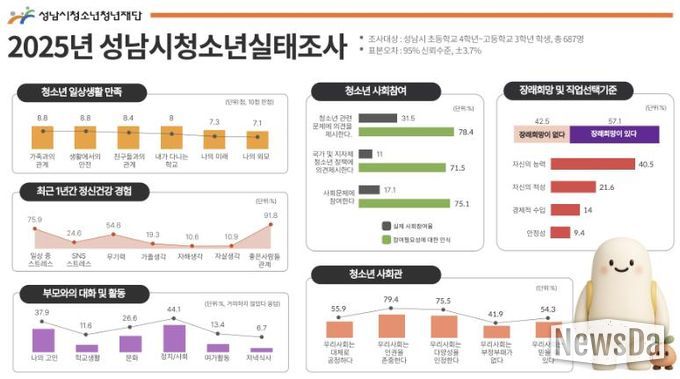 뉴스다 최광묵 기자 | 성남시청소년청년재단은 관내 초등학교 4학년부터 고등학교 3학년까지의 총 687명을 대상으로 실시한‘2025년 성남시청소년실태조사’결과를 발표했다. 이번 조사는 성남시 청소년의 생활․정서․관계․사회참여 전반의 실태를 종합적으로 파악하기 위한 것으로, 표본오차는 ±3.7%이다.