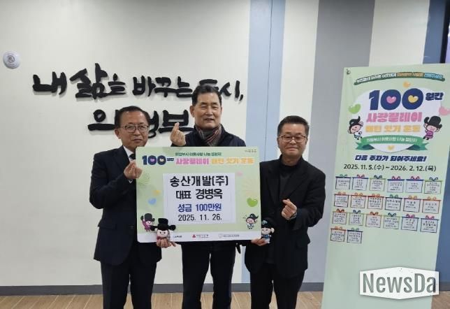 뉴스다 최광묵 기자 | 의정부시 송산3동행정복지센터는 11월 26일 뉴월드공인중개사·송산개발(주) 경병옥 대표가 성금 100만 원을 기탁했다고 밝혔다.