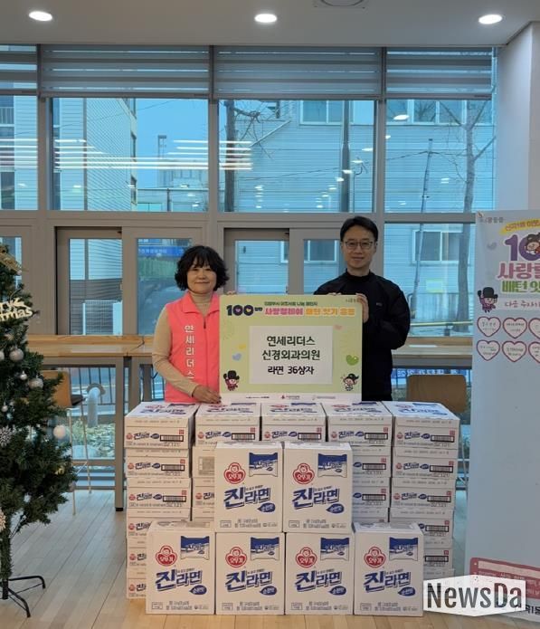 뉴스다 최광묵 기자 | 의정부시 신곡1동주민센터는 11월 27일 연세리더스신경외과의원이 저소득 취약계층을 돕기 위해 라면 36상자를 기탁하며 ‘100일간 사랑릴레이 배턴 잇기’에 동참했다고 밝혔다.