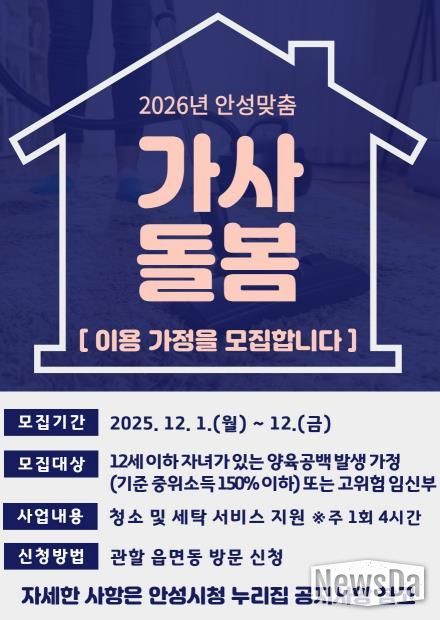 뉴스다 최광묵 기자 | 안성시는 12세 이하 아동을 양육하는 양육공백 가정과 고위험 임신부의 가사부담을 완화하기 위해 2026년 안성맞춤 가사돌봄 지원사업 이용가정을 12월 1일부터 12일까지 2주간 모집한다고 밝혔다.