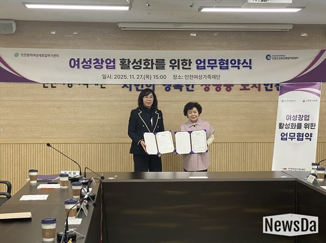 뉴스다 최광묵 기자 | 인천신용보증재단 인천소상공인종합지원센터와 인천여성가족재단 인천광역여성새로일하기센터는 '여성 창업 활성화를 위한 업무협약'을 체결했다고 27일 밝혔다.