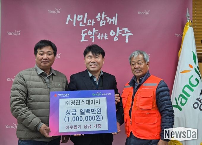뉴스다 최광묵 기자 | ㈜영진스테이지는 지난 27일 양주시 남면행정복지센터를 방문해 지역 내 어려운 이웃을 위한 이웃돕기 성금 100만 원을 전달했다.