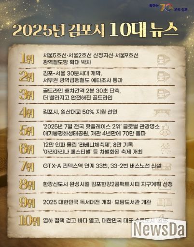 뉴스다 최광묵 기자 | 2025년 김포시민에게 가장 사랑받은 김포시 정책은 ‘서울5호선·서울2호선 신정지선·서울9호선 광역철도망 확대 박차’(141표, 13%)인 것으로 집계됐다. 이외에도 2,3,4위까지 모두 ‘서부권광역급행철도 예타조사 통과’(12%), ‘골드라인 배차간격 2분 30초 단축’(10%), ‘일산대교 50% 지원 선언’(7%)이 선정, 7위에도 ‘GTX-A 킨텍스역 연계 33번, 33-2번 버스노선 신설(5%)’이 랭크돼 시민 관심이 교통이슈에 여전히 집중되어 있고, 현안을 해소하기 위한 노력이 시민들로부터 많은 공감과 응원을 받고 있음을 확인할 수 있었다.