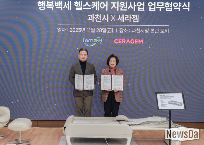뉴스다 최광묵 기자 | 과천시는 28일 시청 본관 1층에서 헬스케어 전문기업 ㈜세라젬과 ‘행복백세 헬스케어 지원사업’ 업무협약을 체결하고, 시민들이 일상 속에서 쉽고 편리하게 건강을 관리할 수 있는 환경 조성에 나선다고 밝혔다.