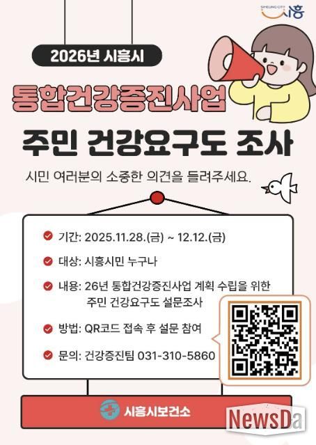 뉴스다 최광묵 기자 | 시흥시는 2026년 지역사회 통합건강증진사업 계획 수립을 위해 오는 12월 12일까지 지역 주민을 대상으로 보건의료서비스 전반에 관한 주민 건강요구도 조사를 실시한다.