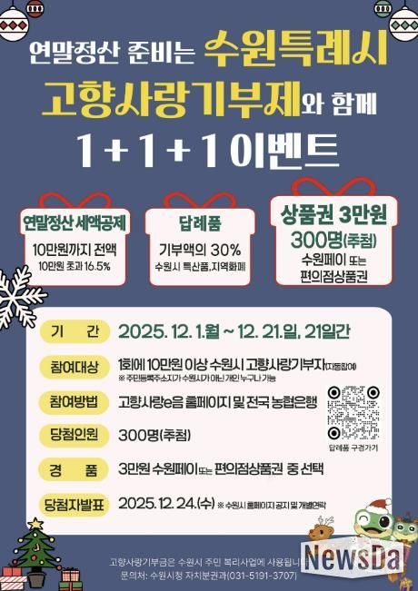 뉴스다 최광묵 기자 | 수원특례시가 고향사랑기부제 참여자 중 300명을 추첨해 상품권을 제공하는 연말 이벤트를 진행한다.
