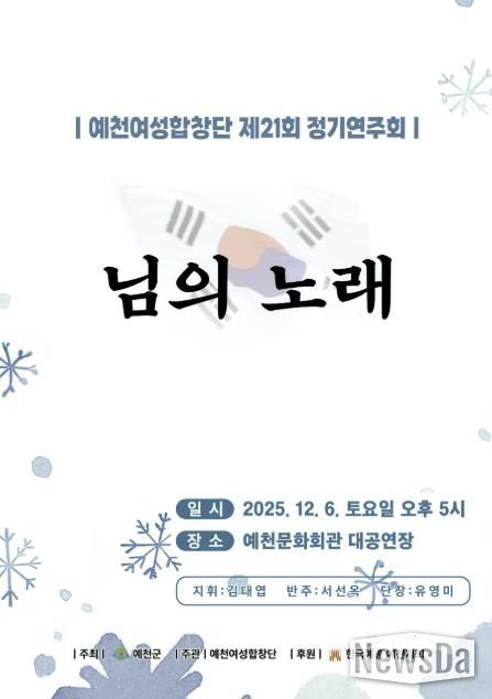 뉴스다 최광묵 기자 | 순수와 열정으로 가득한 예천여성합창단의 ‘제21회 정기연주회’가 6일 오후 5시, 예천군문화회관에서 열릴 예정이다.