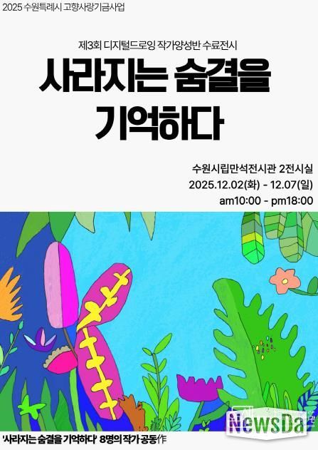 뉴스다 최광묵 기자 | 고향사랑기부금 사업으로 운영된 ‘발달장애인 디지털드로잉작가 양성교육’의 성과를 담은 전시회 ‘사라지는 숨결을 기억하다’가 12월 7일까지 수원시립만석전시관에서 열린다.