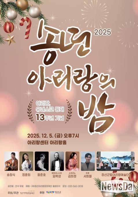 뉴스다 최광묵 기자 | 정선군은 아리랑의 유네스코 인류무형문화유산 등재 13주년을 기념해 오는 12월 5일 아리랑센터 아리랑홀에서 ‘아리랑 송년의 밤’ 행사를 개최한다.