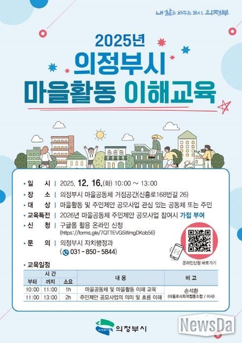 뉴스다 최광묵 기자 | 의정부시는 12월 16일 의정부시 마을공동체 거점공간(신흥로168번길 26)에서 마을공동체에 대한 시민들의 참여 확대와 지속적인 관심을 유도하기 위한 ‘2025년 마을활동 이해교육’을 운영한다.