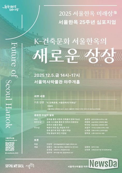 뉴스다 최광묵 기자 | 서울시가 한옥 정책 25주년을 맞아 ‘한옥의 새로운 상상’을 함께 공유하는 심포지엄을 연다. 12월 5일 오후 2시 서울역사박물관 야주개홀에서 열리는 이번 행사는 전문가와 시민 누구나 참여할 수 있다.