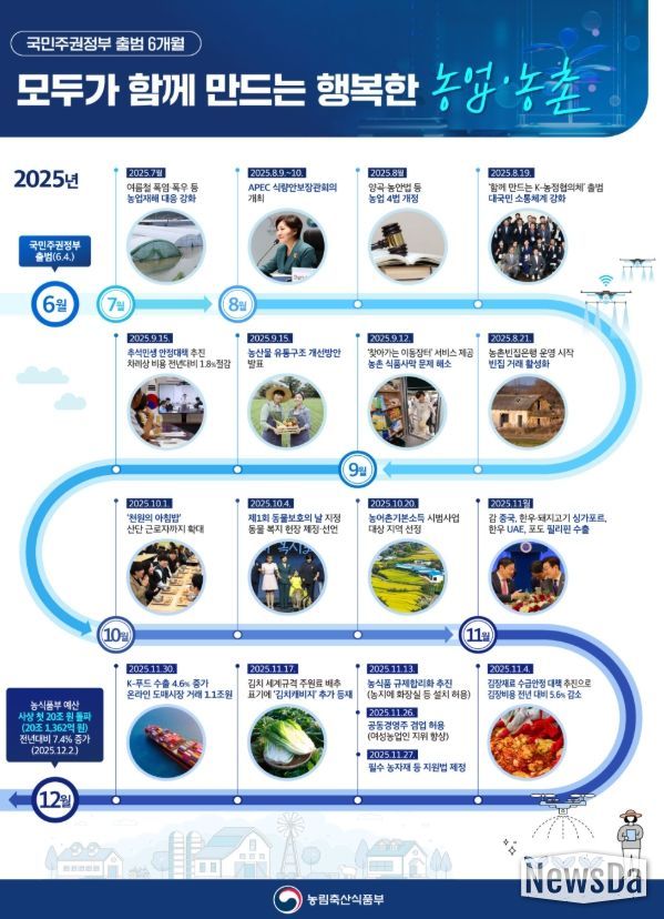 뉴스다 최광묵 기자 | 농림축산식품부는 새 정부 출범 후 약 6개월동안 정책의 연속성과 과감한 혁신 기조 하에서 현장에서 체감할 수 있는 변화를 이끌어 내는 동시에, 만성적 쌀 공급 과잉, 농촌 고령화 등 농업·농촌의 구조적 문제 해결과 희망을 실현하는 농업·농촌을 만들기 위해 전력을 다하고 있다.
